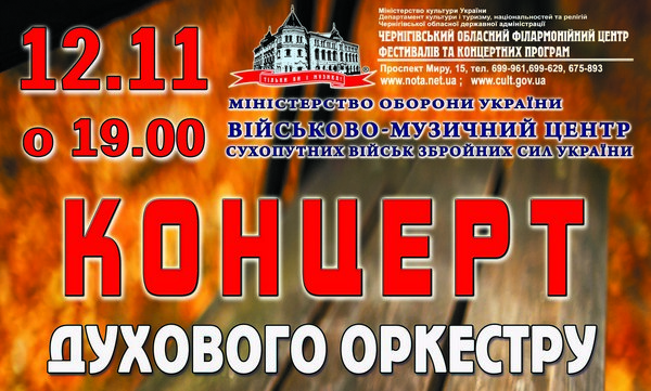 12 листопада. Концерт духового оркестру Військово-музичного центру Сухопутних Військ ЗСУУкраина, Чернигов и область | Местные новости | 29-10-2014 02:38 | Управління культури і туризму :. Чернігівщина > Вести от этого источника