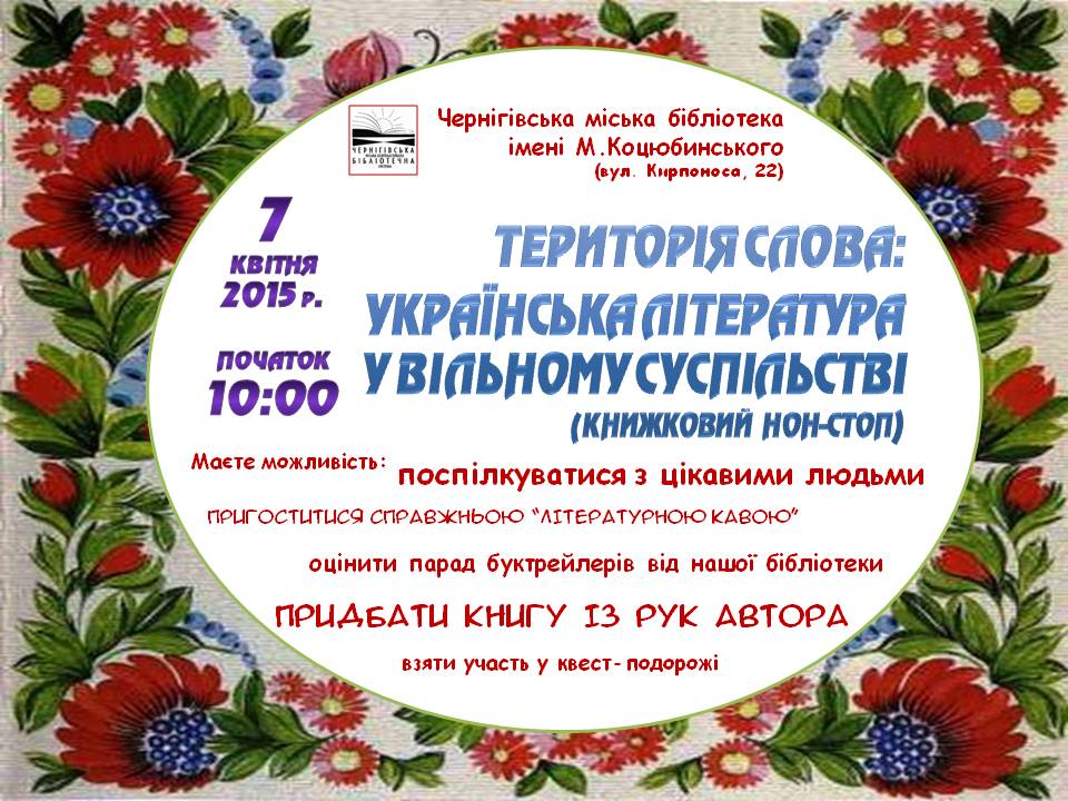7 квітня. Книжковий нон-стоп «Територія слова: українська література у вільному суспільстві»Украина, Чернигов и область | Местные новости | 02-04-2015 18:35 | Управління культури і туризму :. Чернігівщина > Вести от этого источника