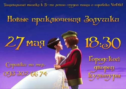 27 травня о 18-30 у Чернігівському Міському Палаці культури, до 5 -річчя студії танцю VerDikt відбудеться танцювальний мюзикл "Нові пригоди Попелюшки" довідки за телефоном: 093-302 66 74 Запрошуємо! Источник: Управління культури і туризму :. Чернігівщина | Прочитать на источнике |