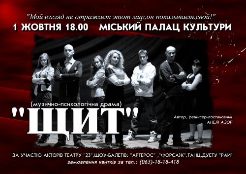 АНОНС. 1 жовтня прем' єра вистави "ЩИТ" у рамках благодійного проекту "Поза шоу-бізнесом". Міський Палац культуриУкраина, Чернигов и область | Местные новости | 19-09-2011 00:23 | Управління культури і туризму :. Чернігівщина > Вести от этого источника